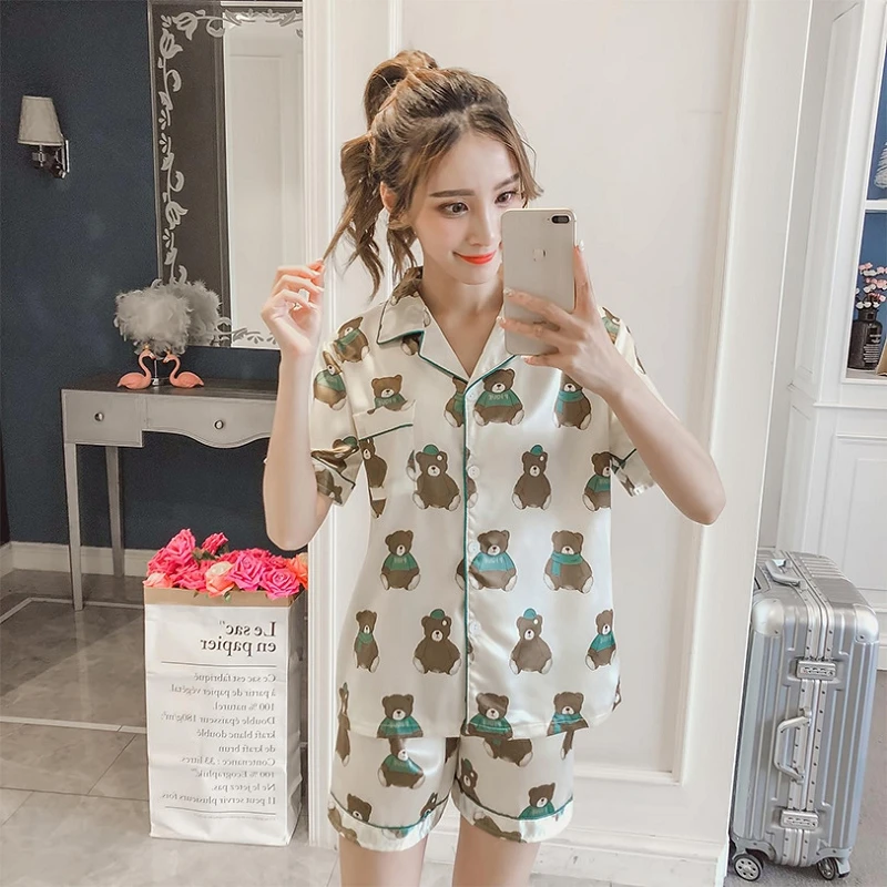 Satin Silk Short Sleeve Print Women's Pajama Sets Pink Women Nightie 2019 Summer Spring Woman Sleep