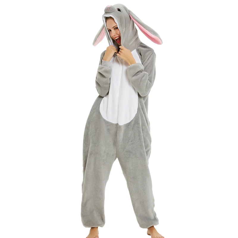 Hot deal women's new animal rabbit pajamas set adult men women winter flannel hooded sleepwear soft cartoon