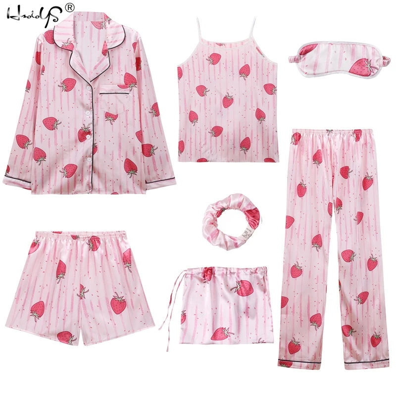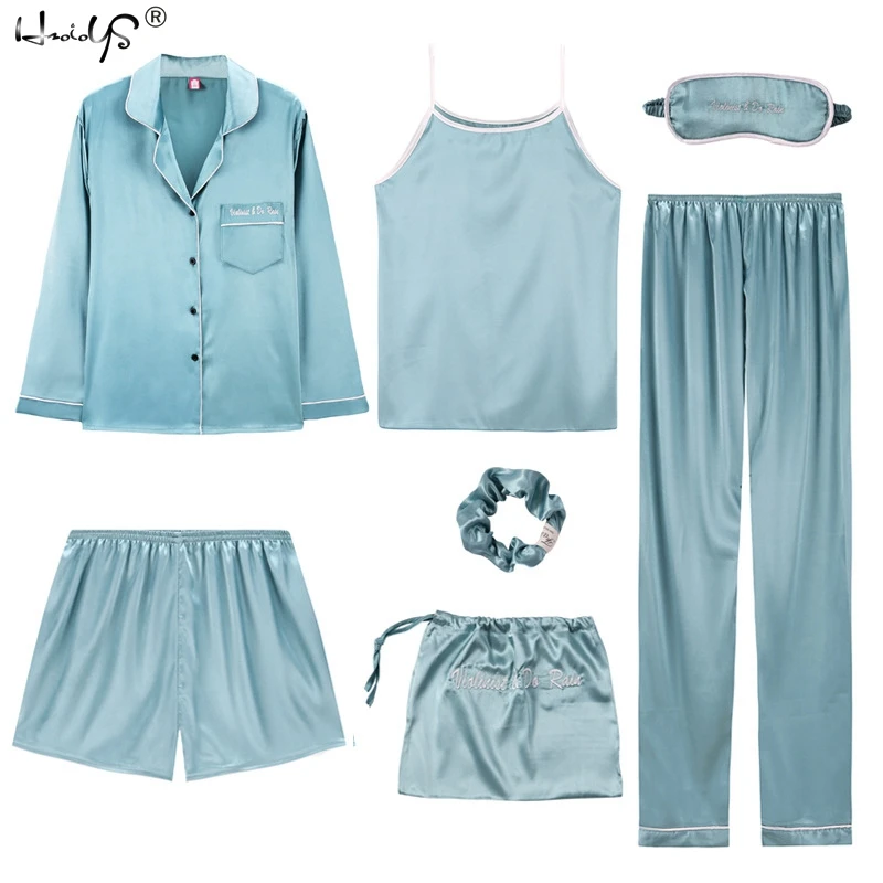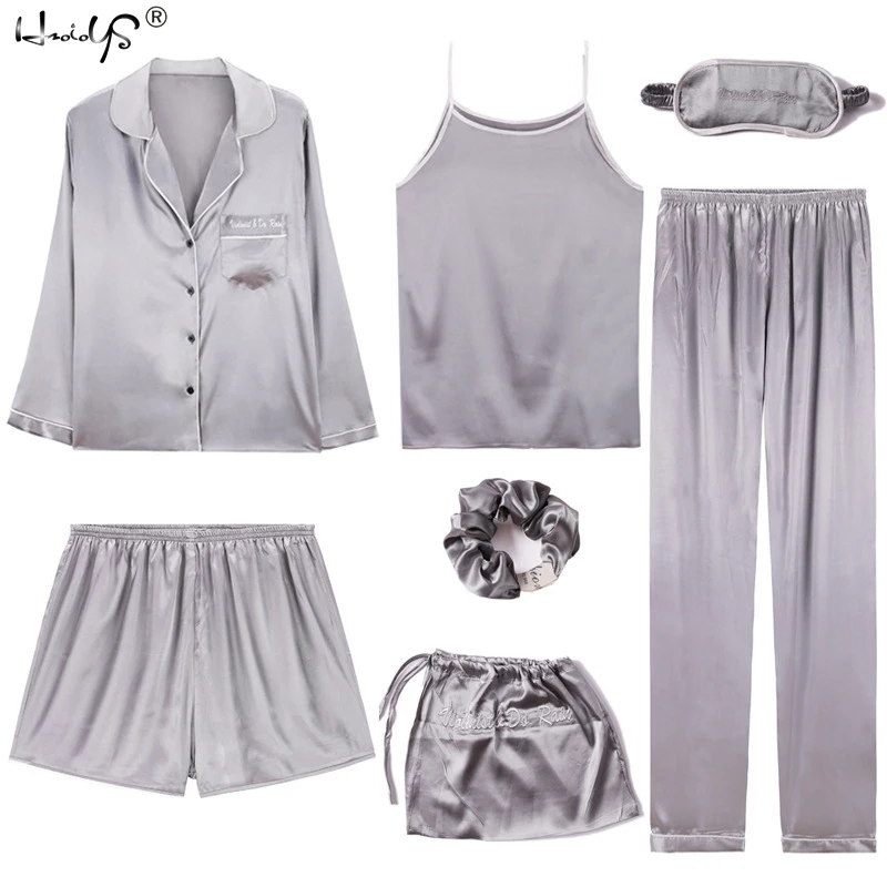2019 Sexy Spring Summer 7 Peices Pajamas Sets Women Silk Satin Pajama Set Soft Sleepwear Home Clothes Womens Pyjamas Suit