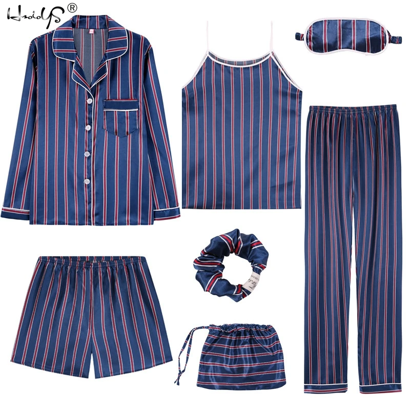 2019 Women 7 Pieces Pajamas Sets Stripe Printing Satin Silk Pajamas Women's Sleepwear Lovely Home C