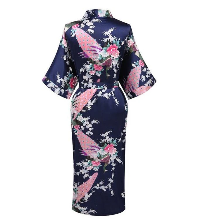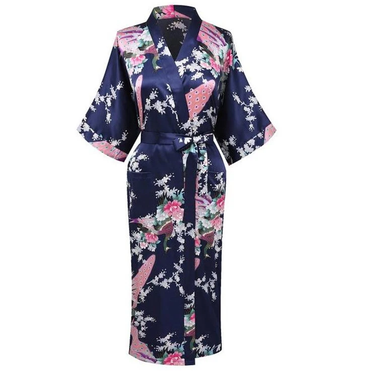 Hot deal Navy Blue Summer Vintage Rayon Satin Robe Gown Women's Sexy Kimono Yukata Gown Sleepwear Peacock Si