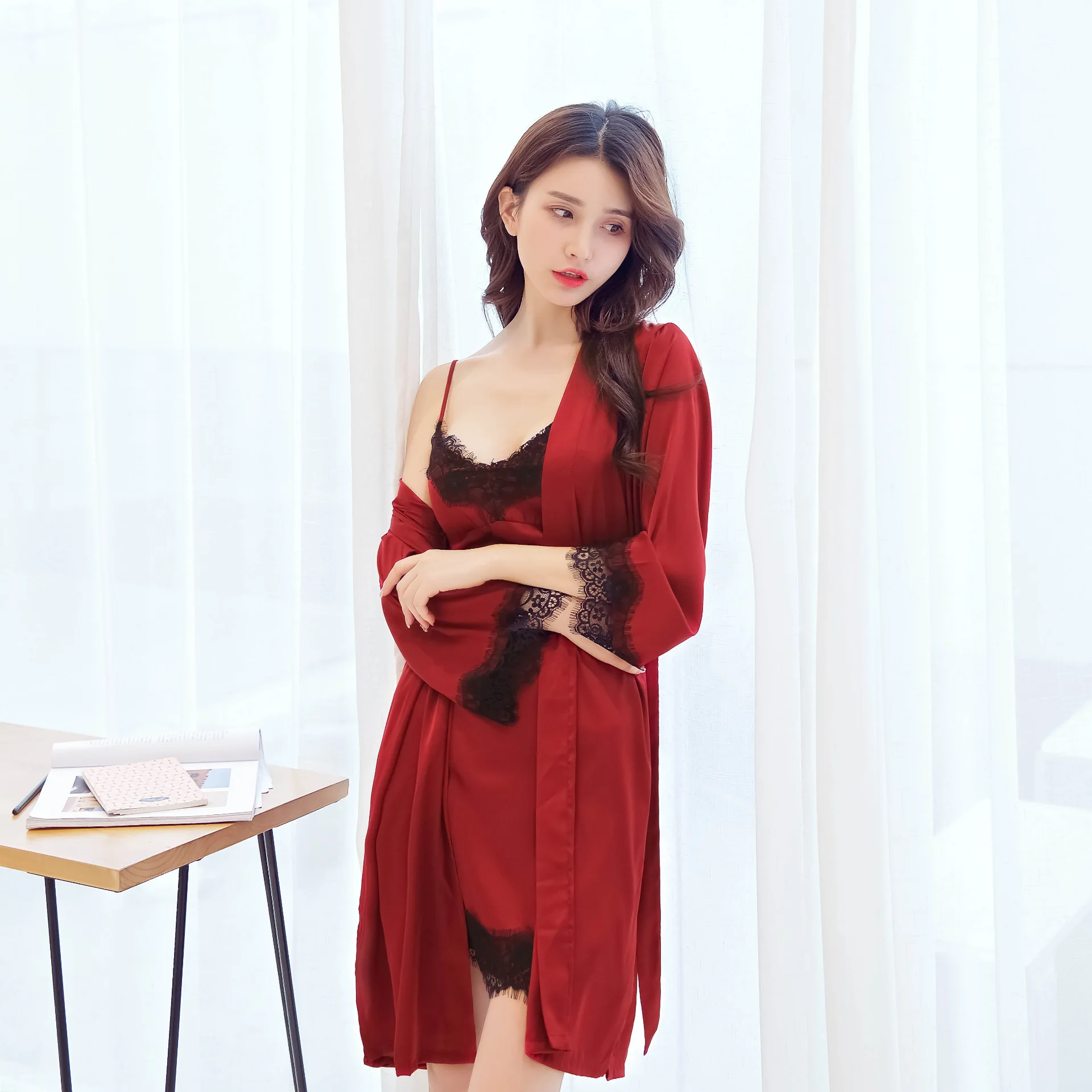 Sexy Lace Women's Robe & Gown Sets Bathrobe + Mini Night Dress Two Pieces female Sleepwear Sleep Se